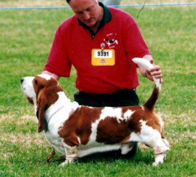 Sage, owned and campaigned by Tim & Sue Thompson, won his first CC and Best of Breed at South Wales 1994, under breed specialist Doreen Gilberthorpe. Both his other CC’s came in 1995, first at Basset Hound Club of Northern Ireland under breed specialist Colin Gillanders. Sage gained his title at Belfast under Mr D. Dowdall. Sage is one of three Champions from this litter; he is litter brother to Ch Switherland Surprise and Ch. Switherland Strudel.